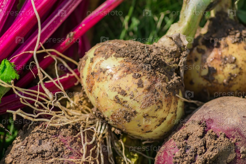 Закройте свежие урожаи органической свеклы и лука на фоне поля. Натуральная растительная пища для сельского хозяйства