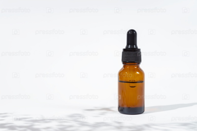 Янтарная бутылка с черной крышкой с сывороткой красоты или эфирным маслом с тенями цветов. Белый фон с дневным светом. Концепция красоты для ухода за лицом и телом. Успокаивающее масло КБД