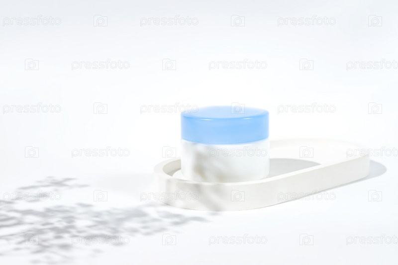 Пластиковая банка с кремом для лица на бетонном подносе. Белый фон с дневным светом и красивыми тенями. Средства по уходу за кожей, натуральная косметика. Концепция красоты для ухода за лицом и телом