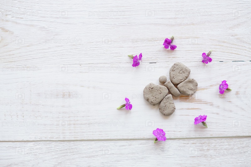 Вид сверху, глиняная бабочка и розовые цветы на белом деревянном фоне