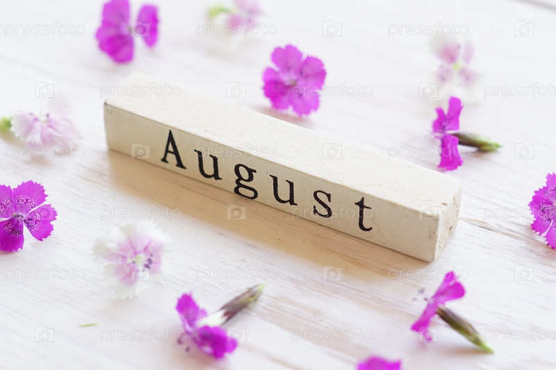 Вид сверху деревянного календаря со знаком августа и розовыми цветами