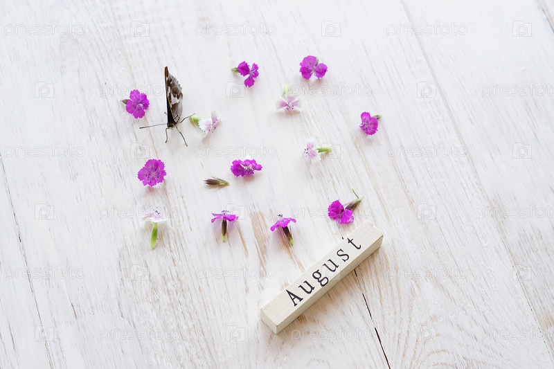 Вид сверху деревянного календаря со знаком августа, бабочкой и розовыми цветами