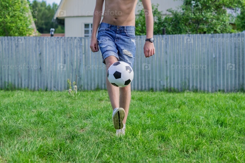 Молодой человек в джинсовых джинсах и белых кроссовках играет в футбольный мяч на открытом воздухе. Футболист-любитель чеканит мяч