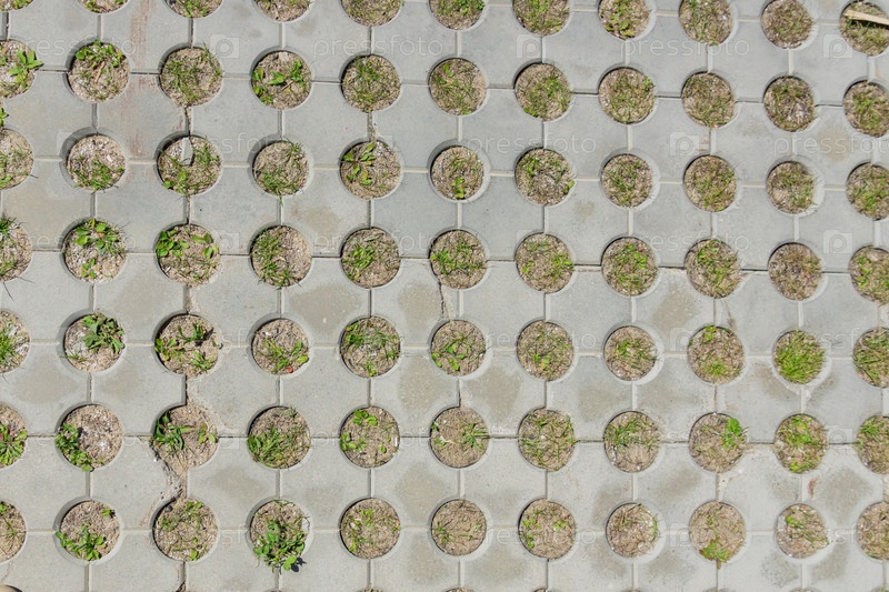 Вид сверху на бетонный тротуар с растущей травой. Фоновая текстура