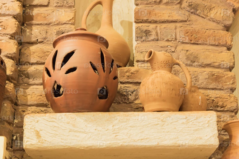Глиняные банки на каменной полке в восточной комнате. крупным планом