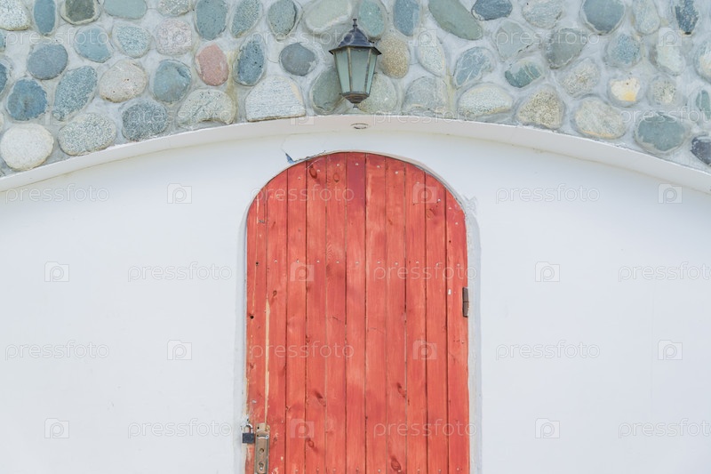 Белая стена, украшенная камнями, уличный фонарь над красной деревянной дверью