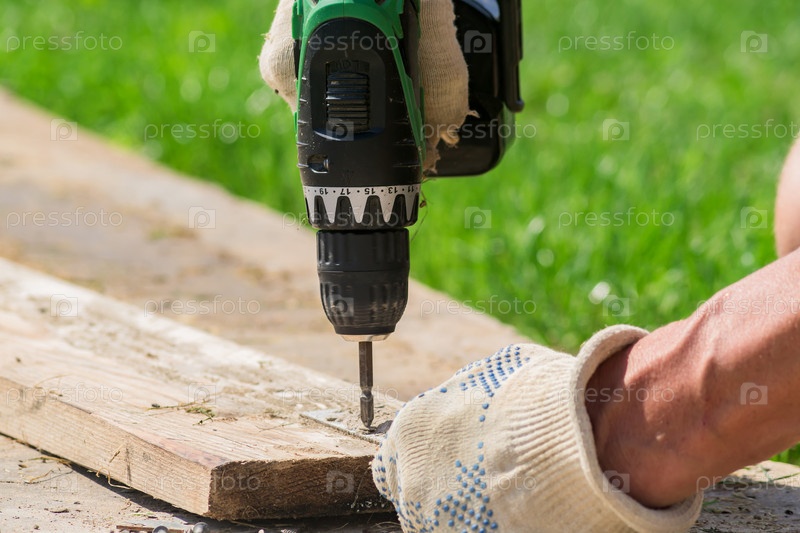 Электрическая отвертка в мужской руке в текстильной перчатке на открытом воздухе. Мужчина работает ручным инструментом на заднем дворе