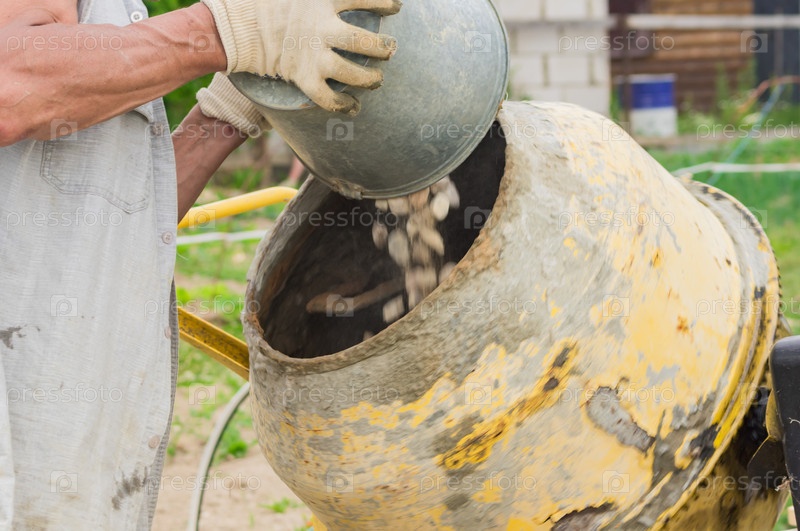 Строитель делает бетон во вращающейся бетономешалке. процесс создания цемента на строительной площадке