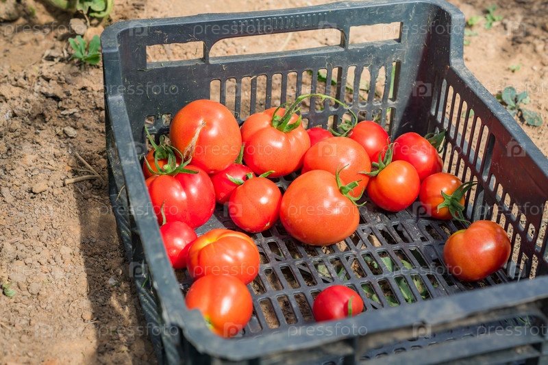 Свежий урожай органических помидоров в коробке. Новый урожай вкусных овощей, только что собранных в пластиковом контейнере