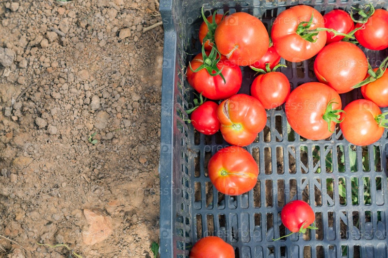 Свежий урожай органических помидоров в коробке. Новый урожай вкусных овощей, только что собранных в пластиковом контейнере