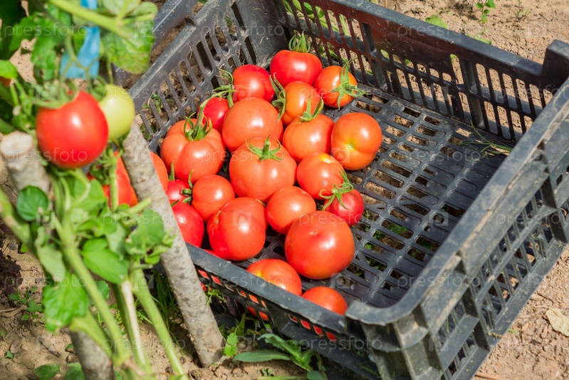 Свежий урожай органических помидоров в коробке. Новый урожай вкусных овощей, только что собранных в пластиковом контейнере