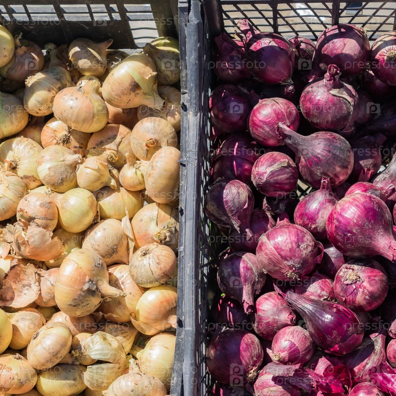 Вид сверху на свежесобранные луковицы в пластиковом ящике