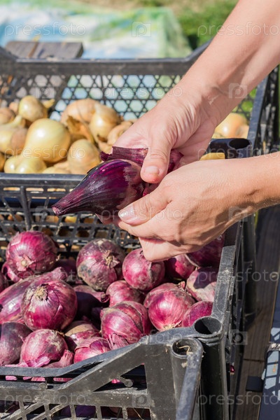 Новый урожай лука в пластиковых ящиках. Женская рука чистит спелый красный лук