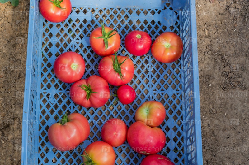 Свежий урожай органических помидоров в коробке. Новый урожай вкусных овощей, только что собранных в пластиковом контейнере
