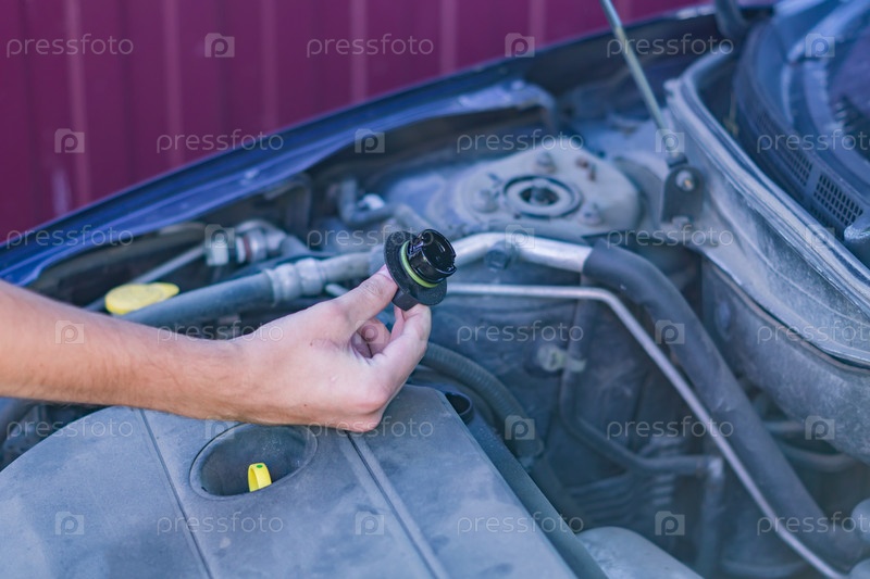 Механик проверяет и чинит крышку маслозаливной горловины сломанной машины в машине на дороге