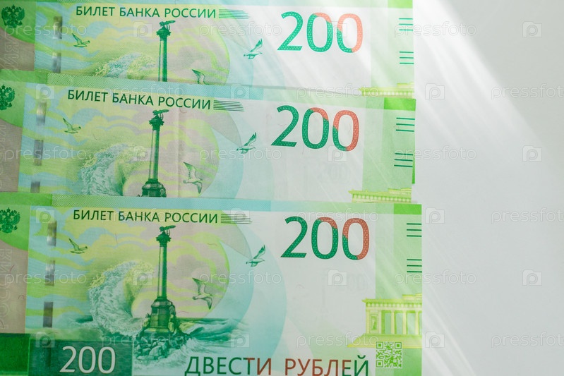 Новые российские банкноты на белом фоне. двести рублей. Наличные бумажные деньги