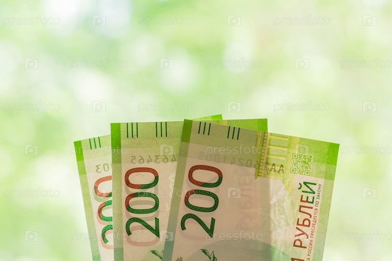 Новые российские банкноты на зеленом фоне боке. двести рублей. Наличные бумажные деньги