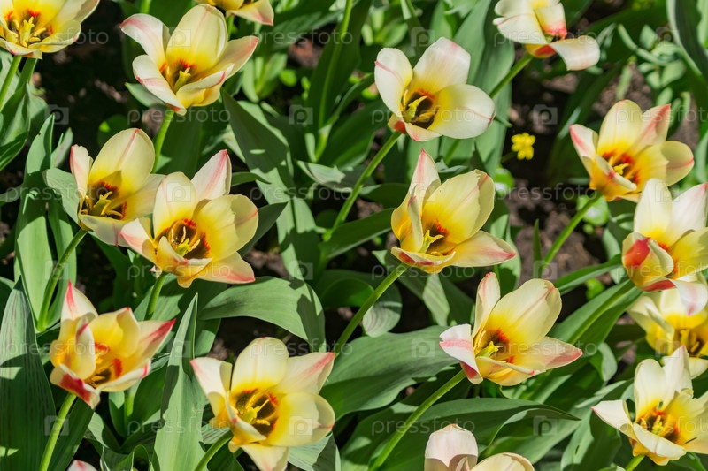 Фон ярких цветущих желтых и оранжевых тюльпанов