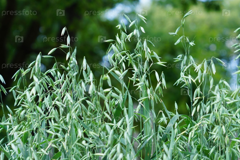 Крупный план зеленых колосьев овса на поле, выборочный фокус