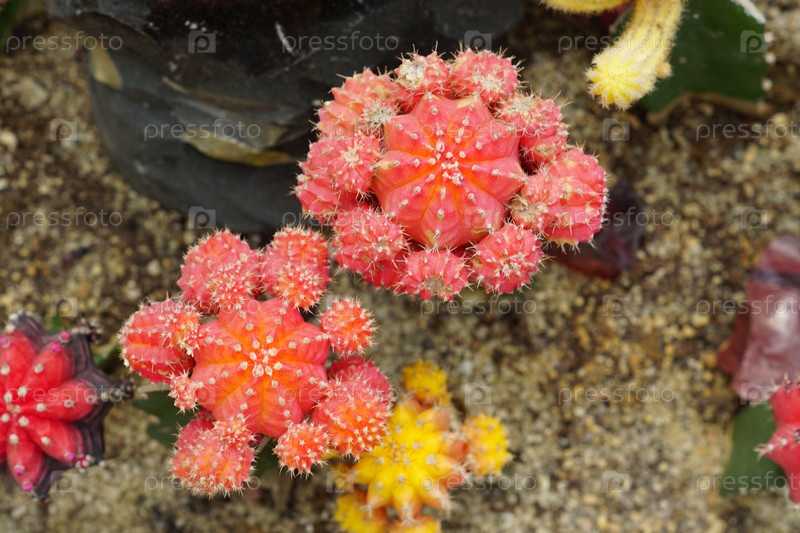 Вид сверху на цветущие красные и желтые кактусы. природный фон