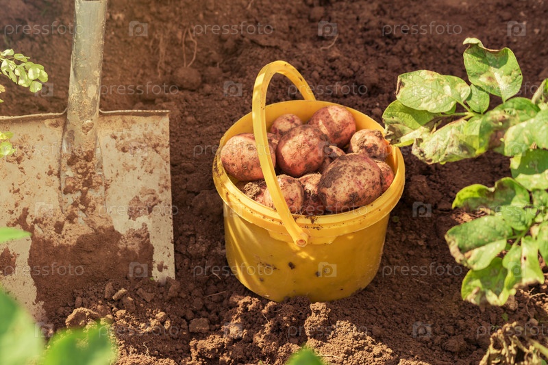 Сбор свежего органического картофеля из почвы в пластиковое ведро. Натуральные овощи свежие сельскохозяйственные продукты