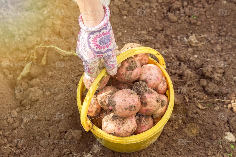 Руки собирают свежий органический картофель из почвы в пластиковое ведро. Натуральные овощи свежие сельскохозяйственные продукты