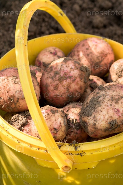 Сбор свежего органического картофеля из почвы в пластиковое ведро. Натуральные овощи свежие сельскохозяйственные продукты