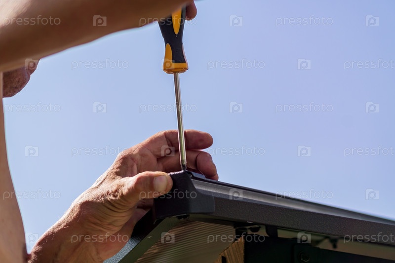 Отвертка в мужских руках. Рабочий с ручным инструментом, собирающий металлоконструкции на открытом воздухе