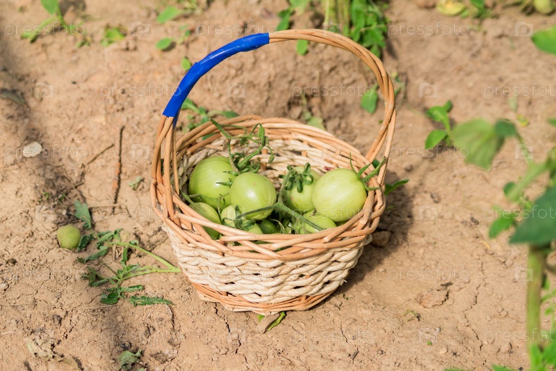 Новый урожай или урожай. Зеленые свежие помидоры в корзине