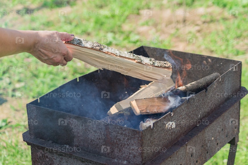 Женская рука положила березовые дрова в гриль-барбекю. Кемпинг, приготовление пищи на открытом воздухе