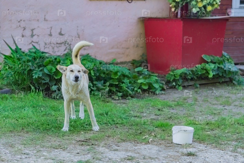 Белая бездомная бездомная собака на улице