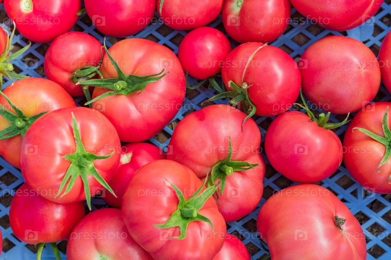 Свежий урожай органических помидоров в коробке. Новый урожай вкусных овощей, только что собранных в пластиковом контейнере