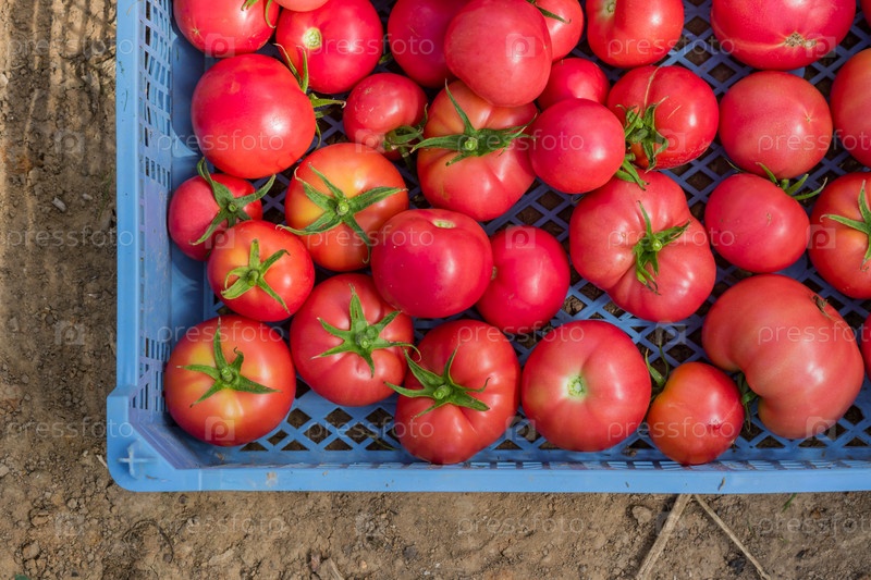 Свежий урожай органических помидоров в коробке. Новый урожай вкусных овощей, только что собранных в пластиковом контейнере
