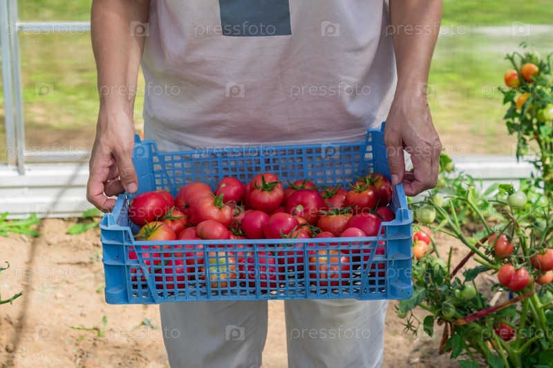Женщины держат пластиковую коробку со свежим урожаем органических помидоров. Новый урожай вкусных овощей, только что собранных в пластиковом контейнере