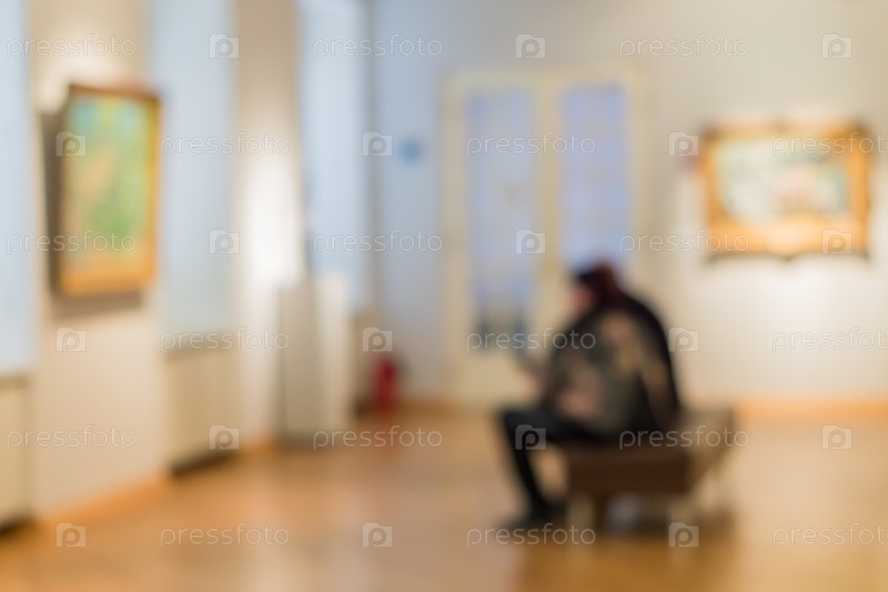 Расфокусированная картина людей, посещающих художественный музей. Люди рассматривают картины на стене