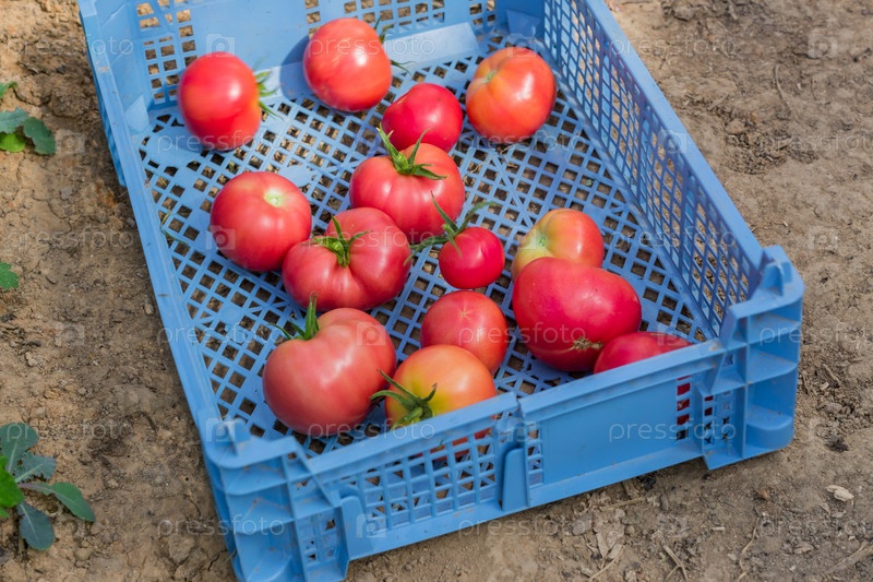 Свежий урожай органических помидоров в коробке. Новый урожай вкусных овощей, только что собранных в пластиковом контейнере