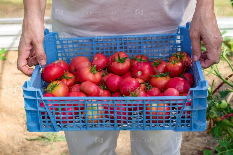 Женщины держат пластиковую коробку со свежим урожаем органических помидоров. Новый урожай вкусных овощей, только что собранных в пластиковом контейнере