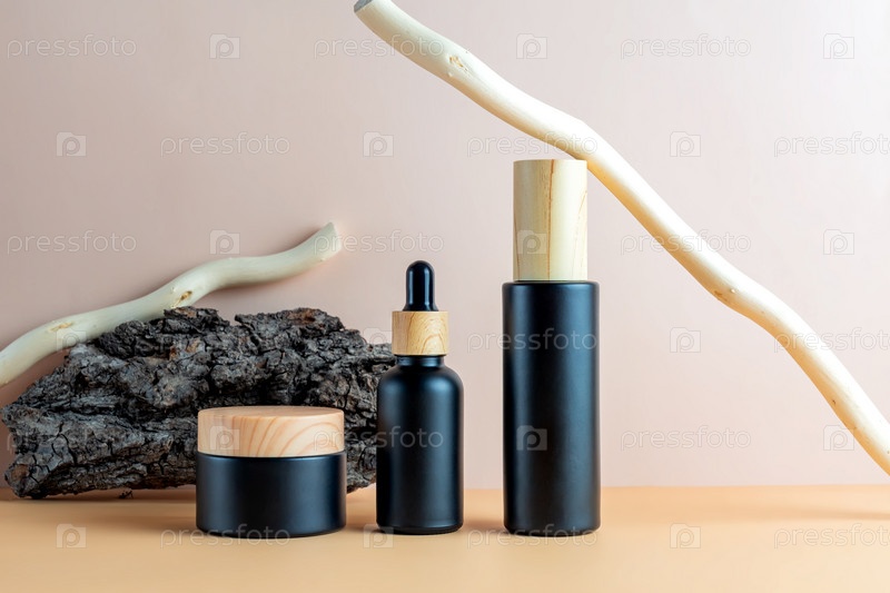 Набор натуральной косметики в упаковке из черного матового стекла на пастельном фоне с деревянной корой и ветвью