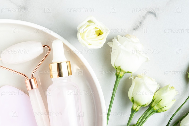 Ролик для лица из нефрита и скребок для камня Гуаша для массажа лица, косметические инструменты для домашнего ухода Сыворотка для лица или эссенция на керамическом подносе на мраморном столе. Натюрмортная композиция с белыми цветами
