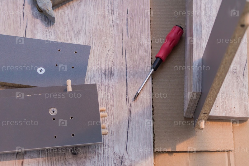 Сборка мебели - отвертка и детали стола на полу