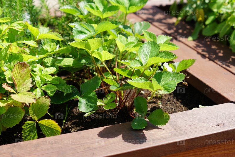 Клубничное растение растет во фруктовом саду, крупным планом
