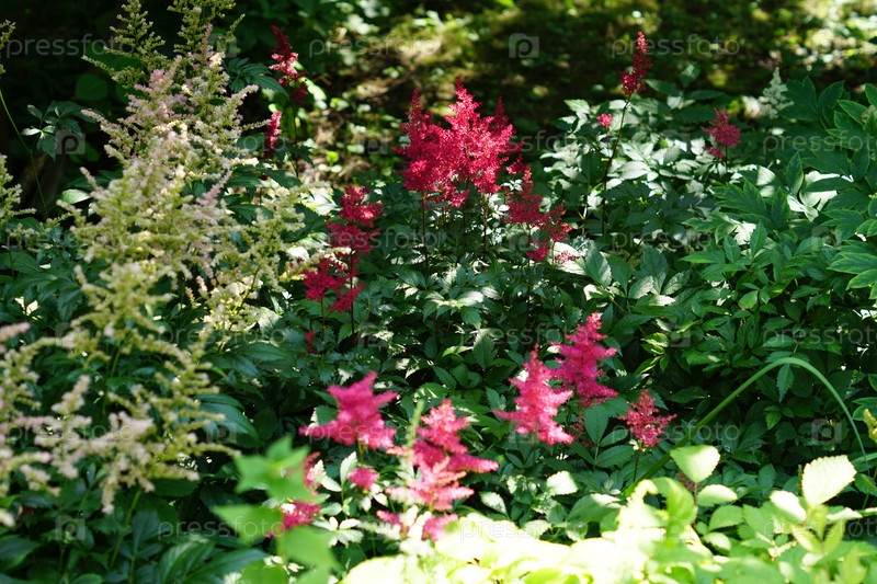 Цветущие красные и белые цветы астильбы в саду