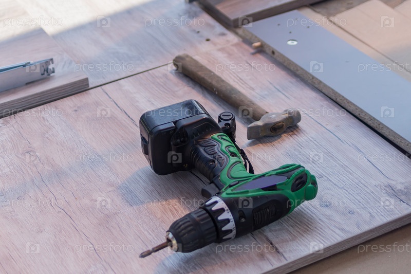 Крупным планом электрической отвертки. Рабочий инструмент плотника на полу
