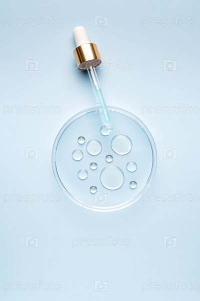 Крупный план сыворотки для лица на синем фоне. Коллаген, гиалуроновая кислота для ухода за кожей. Достижения современной науки в косметике для сохранения красоты в чашке Петри