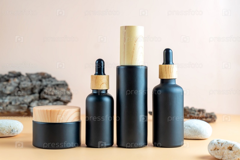 Сыворотка, очищающее средство для лица и увлажняющий крем на бежевом фоне с корой дерева и камнями. Макет косметических товаров. Концепция ухода за кожей