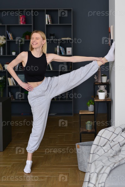 Женщина развлекается во время тренировки, поднимая высоко ногу