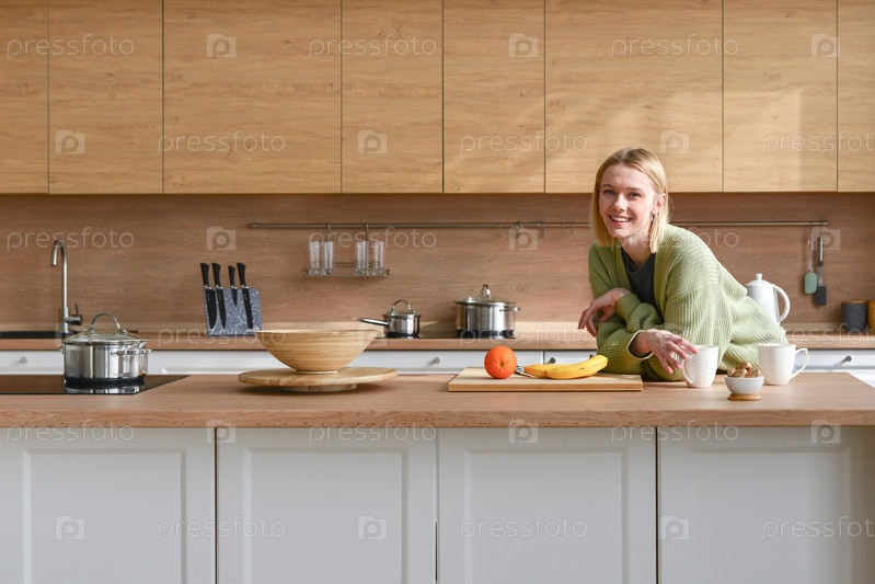Портрет молодой женщины дома на кухне, смотрящей в камеру с улыбкой