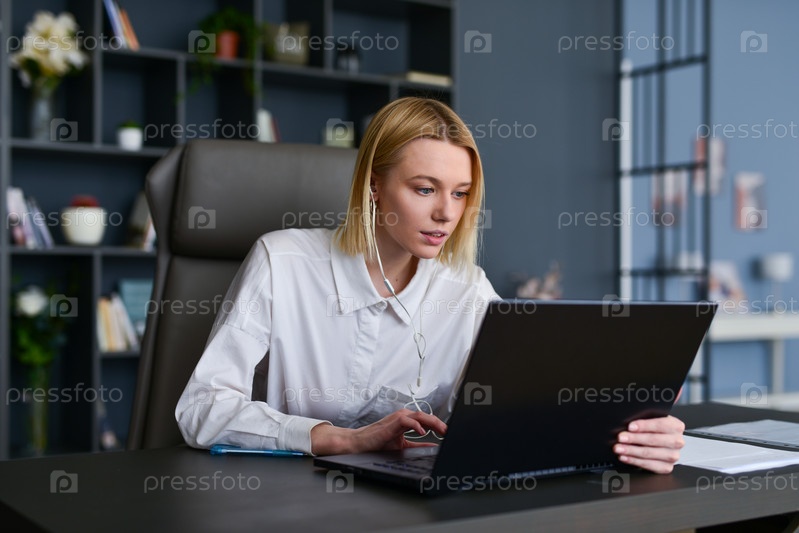 Молодая женщина сидит в домашнем офисе с помощью ноутбука
