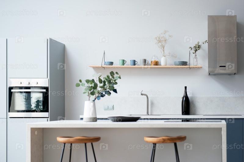 Современный новый светлый интерьер кухни с белой мебелью и обеденным столом