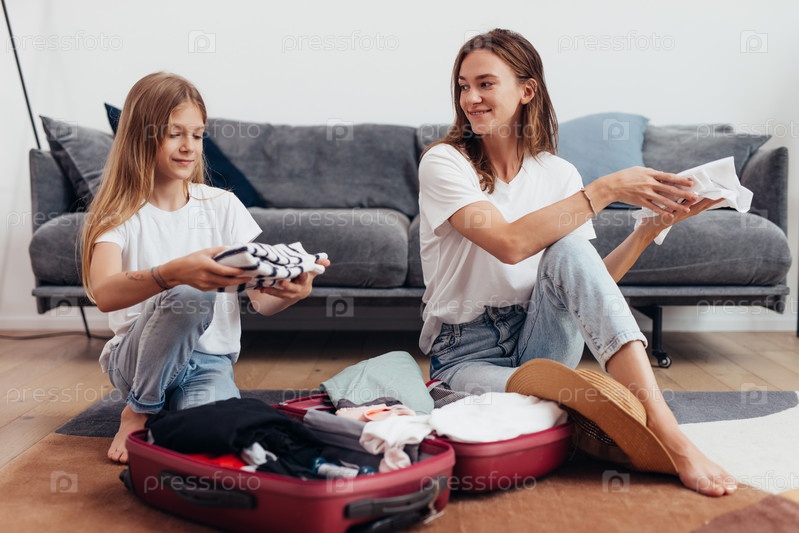 Мать и дочь собираются в путешествие с чемоданом